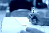 Hands with pen over application form, Students taking exams, writing examination room with undergraduate students inside. Student sitting learning lessons doing final exam in classroom.