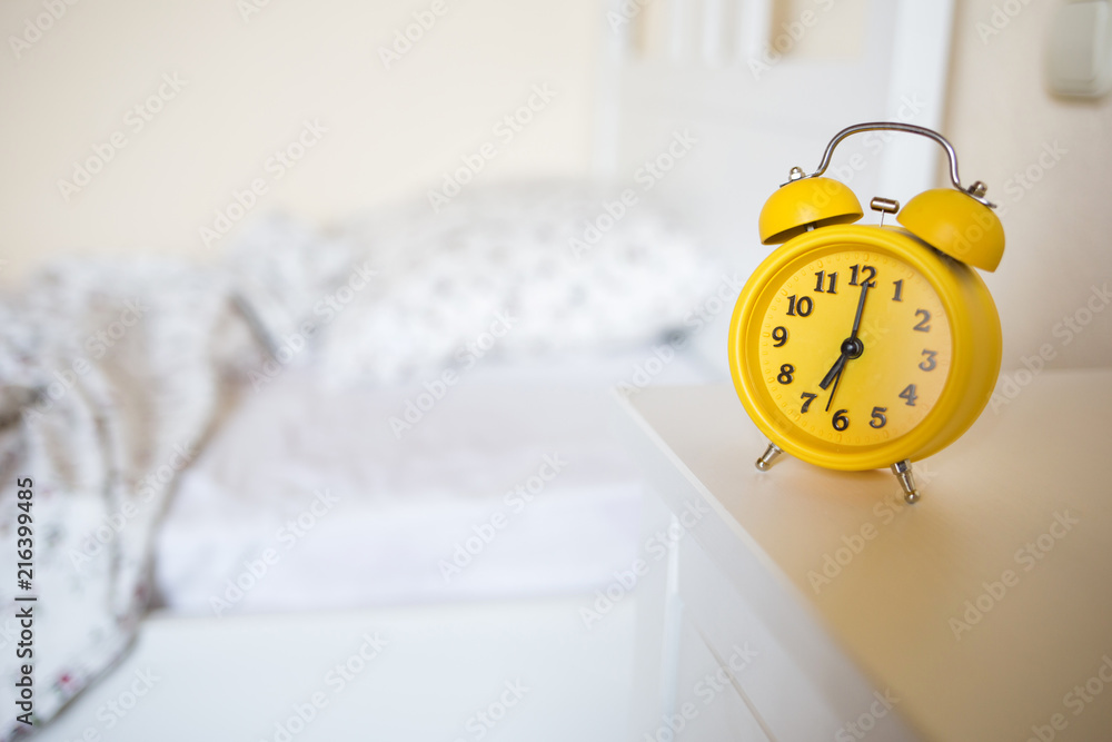 yellow alarm clock standing on nightstand in background of bed in interior of room. bed's not made.