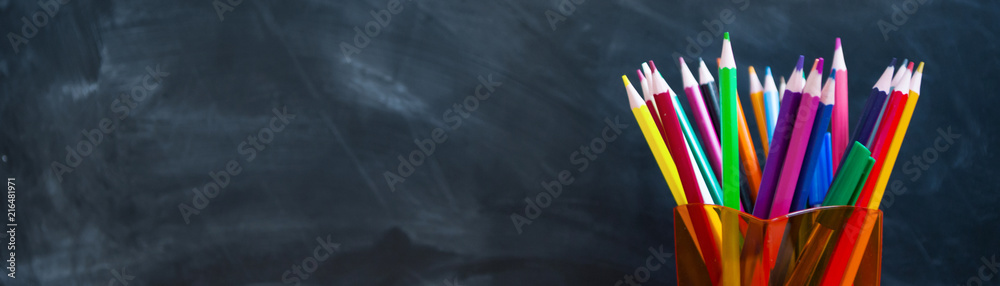 Back to school! Colored pencils in a glass on the background of the school chalkboard