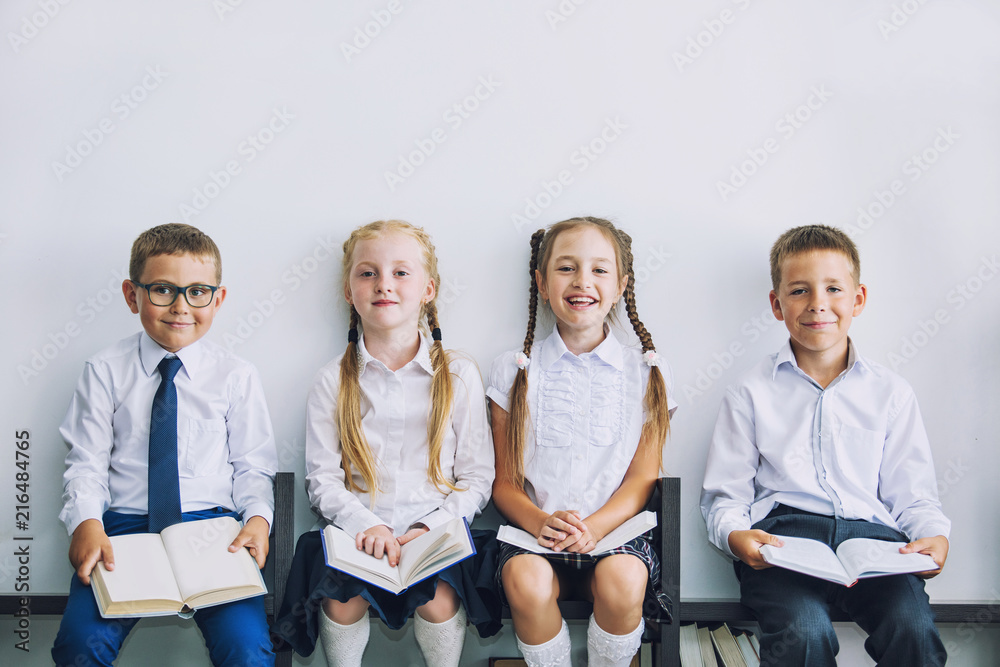 Beautiful children with books studied together in the classroom at school in uniform get educated happy