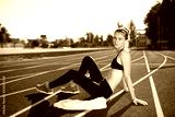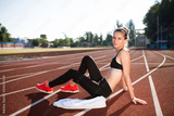 Sporty girl in wireless earphones with white towel nearthoughtfully looking in camera while spending time on treadmill of stadium