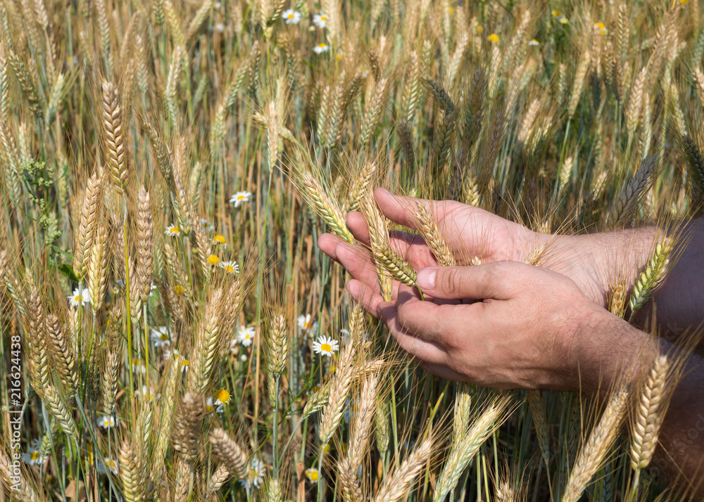 Male hands holding wheat spikelets in field on sunny day, harvest, new crop