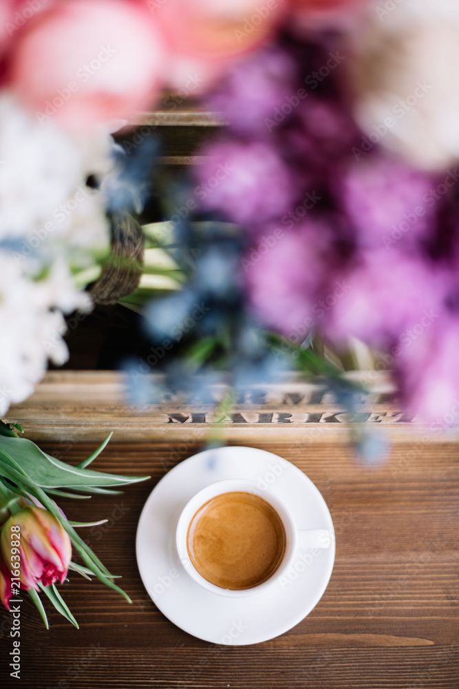 Delicious freshly brewed morning espresso coffee with a beautiful crema standing on the rustic wooden table with blowers blurred on the foreground, top view, flat lay