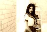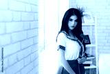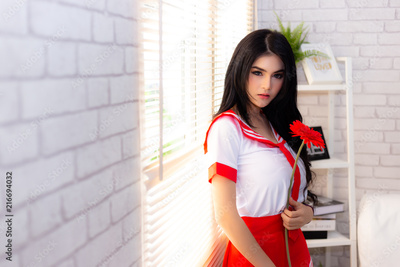 Portrait charming beautiful woman. Attractive beautiful sexy women hold flower and stand near window. Pretty woman wear Japanese student uniform. Gorgeous woman has beautiful face and sexy body. space