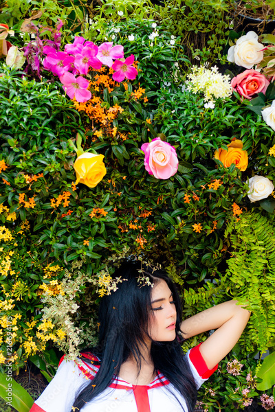 Portrait charming beautiful woman. Attractive beautiful women feels relaxing and happiness when glamour girl come to beautiful park. She close eyes and feels like a dreaming of paradise. copy space