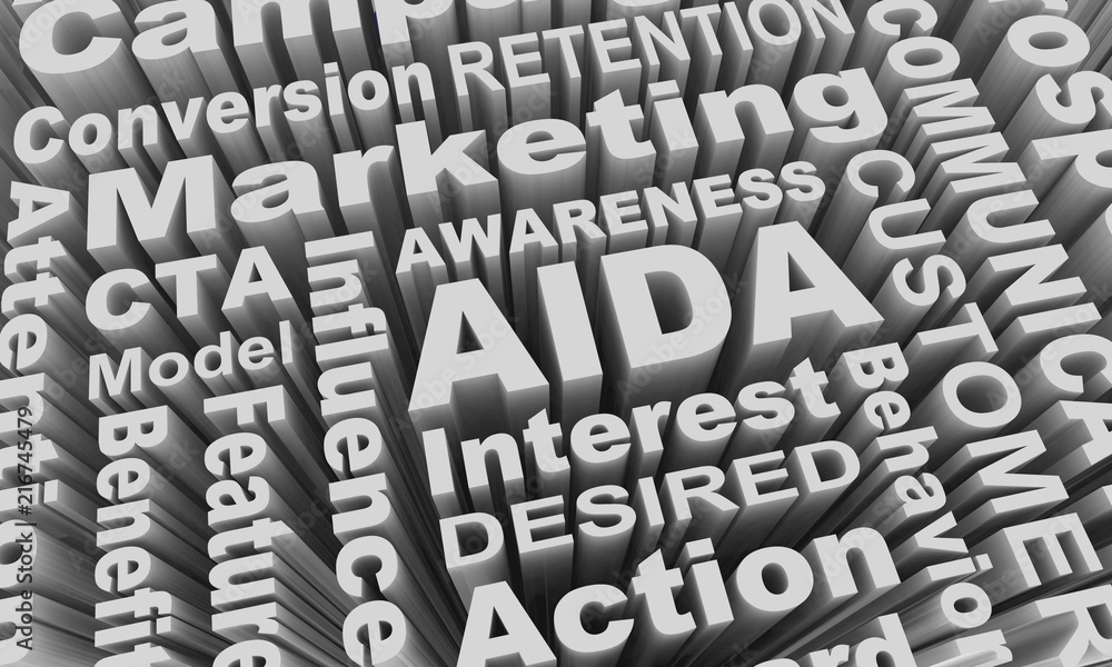 AIDA Awareness Interest Desire Action Marketing Theory Word Collage 3d Illustration