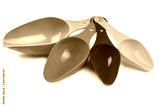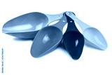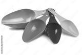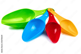 Set of colorful plastic measuring spoon isolated on white background with shadow. Green, blue, red, and orange plastic measuring spoon. Kids toy