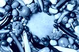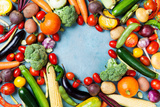 Food background with autumn farm vegetables and root crops on blue table top view. Healthy and organic harvest.