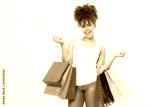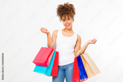Afro Woman shopping. Happy young african american girl with shopping bags isolated on white background. Copy space. Mock up. Summer