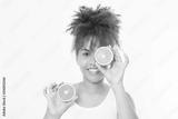 Beautiful young african american woman isolated on white background. Afro girl and diet concept. Copy space. Mock up. Skin care, spa and make up concept. Summer time. Afro curly hair style