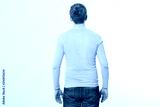 Young man wearing blank t-shirt isolated on white background. Copy space. Place for advertisement. Back view. Mock up. Template shirt