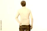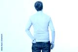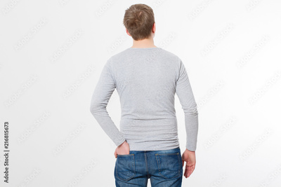 Young man wearing blank t-shirt isolated on white background. Copy space. Place for advertisement. Back view. Mock up. Template shirt
