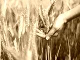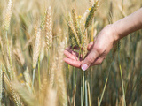 Female hand holding wheat spikelets in field on sunny day, new crop