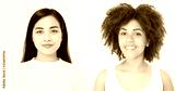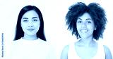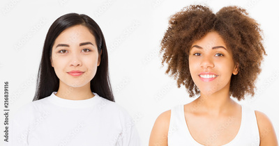 Set of two women faces asian and african american isolated on white background. Skin care and shampoo hairstyle concept. Copy space. Multi ethnic.