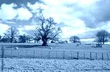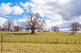 Springtime meadow and some sheep grazing in the Worcestershire countryside of England.