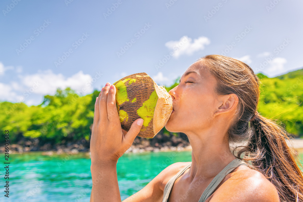 Coconut water Caribbean tropical food tourist woman drinking fresh natural from the coco on cruise ship travel vacation. Asian girl enjoying summer holidays.