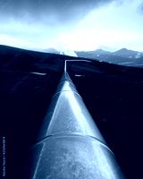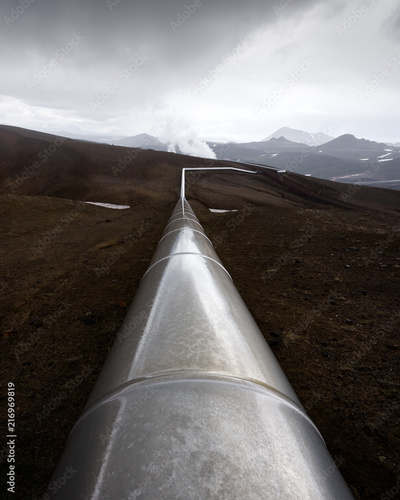 Iceland landscape with pipes in mountains. Geothermal energy in operations