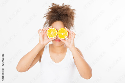 Beautiful young african american woman isolated on white background. Afro girl and diet concept. Copy space. Mock up. Skin care, spa and make up concept. Summer time. Afro curly hair style