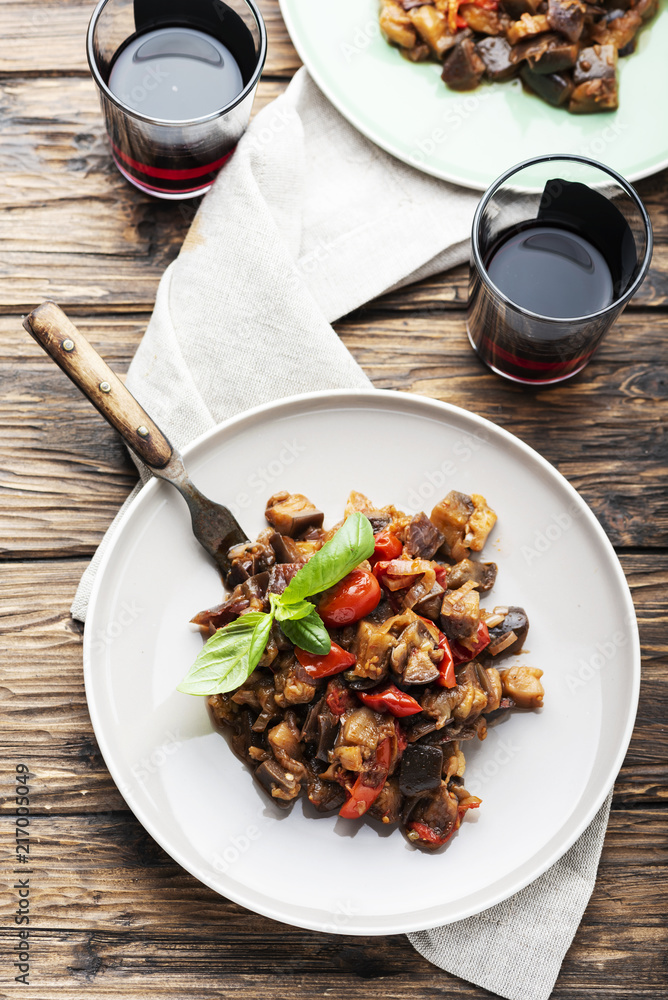 Traditional sicilan eggplant dish caponata on the wooden table, selective focus
