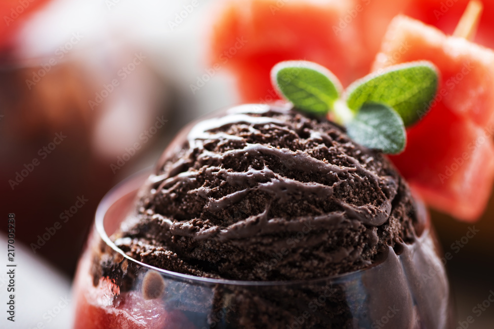Watermelon sorbet with chocolate ice cream, selective focus