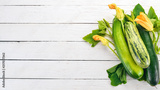 Fresh green zucchini on a white wooden table. Top view. Copy space.