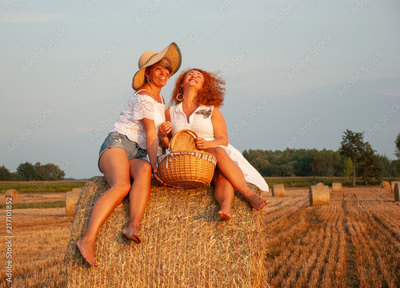 Two attractive women have picnic drink white vine and having fun on a haystack