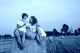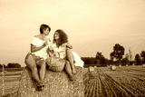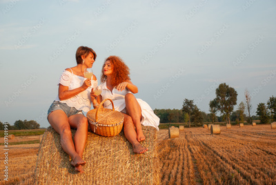 Two attractive women have picnic drink white vine and having fun on a haystack