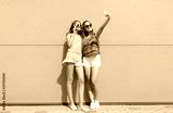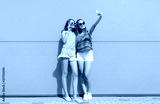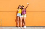 fashion, leisure and technology concept - smiling teenage girls taking selfie by smartphone and showing peace outdoors in summer