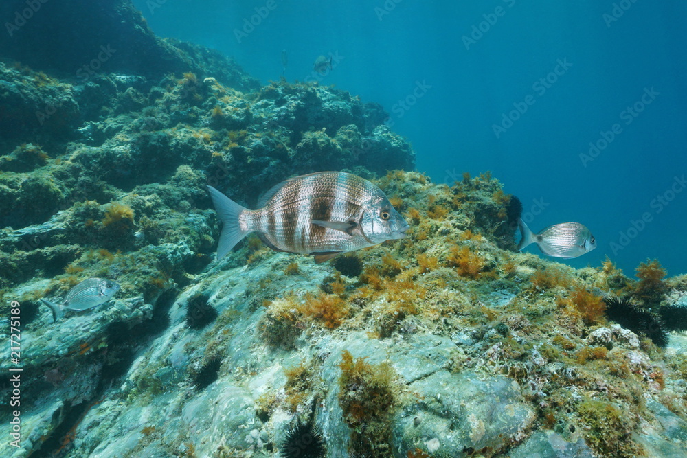 A zebra sea bream fish, Diplodus cervinus underwater in the Mediterranean sea, marine reserve of Cerbere Banyuls, Pyrenees-Orientales, Roussillon, France