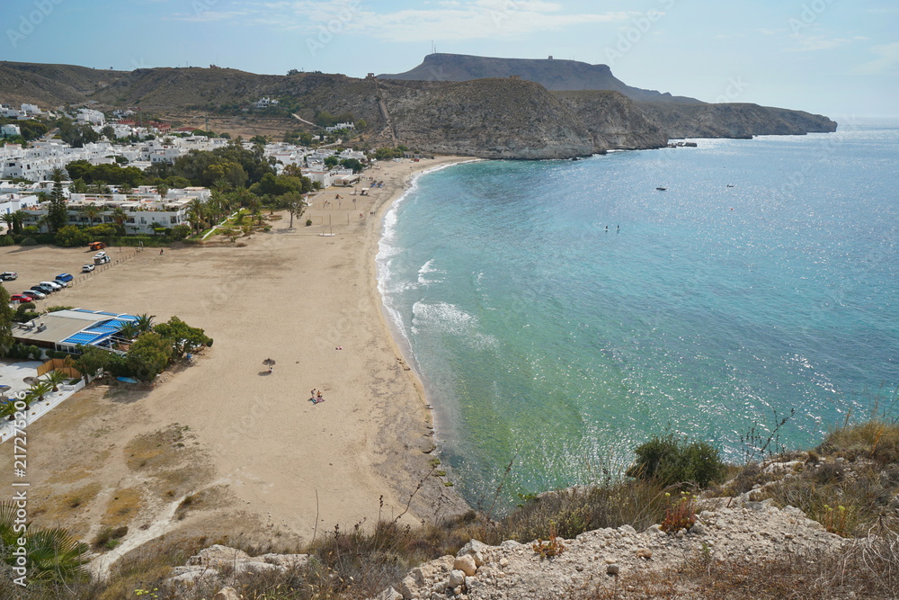 Agua Amarga beach and village in the Cabo de Gata-Nijar natural park, Mediterranean sea, Almeria, Andalusia, Spain