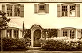 Vine covered entrance to white painted brick house with arched front door and wreath and arched windows with green shutters - landscaped with American flag