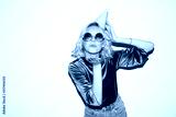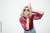 Beautiful girl in velvet blouse,sunglasses and birthday cap sending air kiss over white background isolated