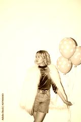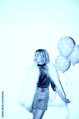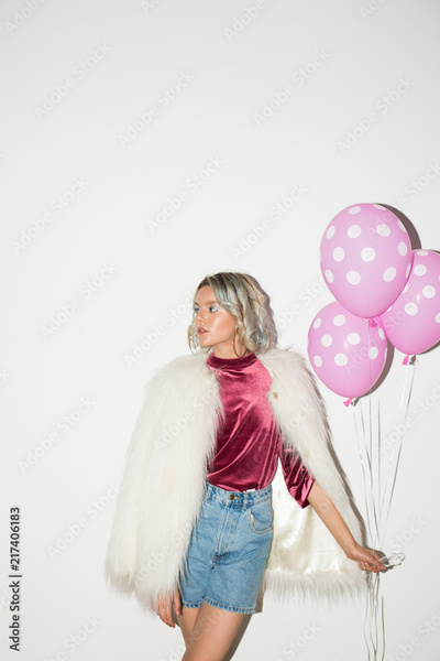 Beautiful girl in white fur jacket and velvet blouse dreamily looking aside while holding pink balloons in hand over white background