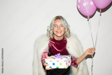 Cheerful girl in white fur jacket and velvet blouse happily showing gift box with pink balloons in hand over white background isolated