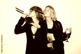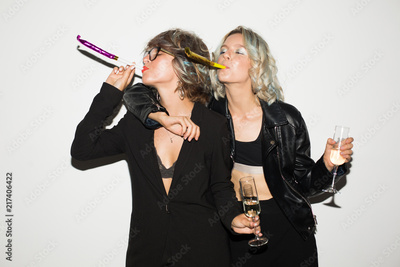 Two beautiful girls in black jackets holding glasses of champagne happily using noisemakers together over white background isolated