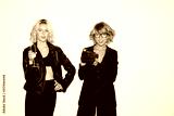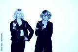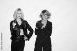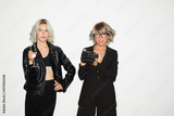 Beautiful girl in leather jacket with glass of champagne and pretty girl in eyeglasses with retro camera in hand dreamily looking in camera together over white background isolated