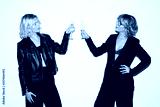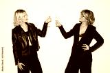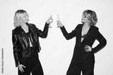 Two beautiful girls in black jackets with glasses of champagne in hands dreamily looking at each other over white background isolated