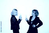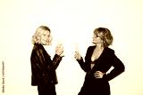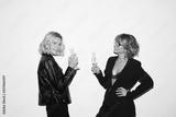 Two beautiful girls in black jackets with glasses of champagne in hands happily spending time together over white background isolated