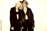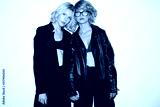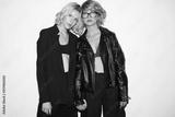 Two beautiful girls in black jackets holding each other's hand dreamily looking in camera over white background isolated