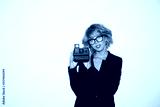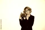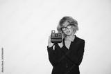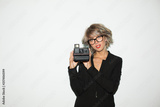 Beautiful girl in black jacket dreamily looking in camera while holding polaroid in hands over white background
