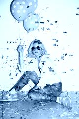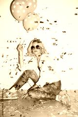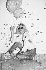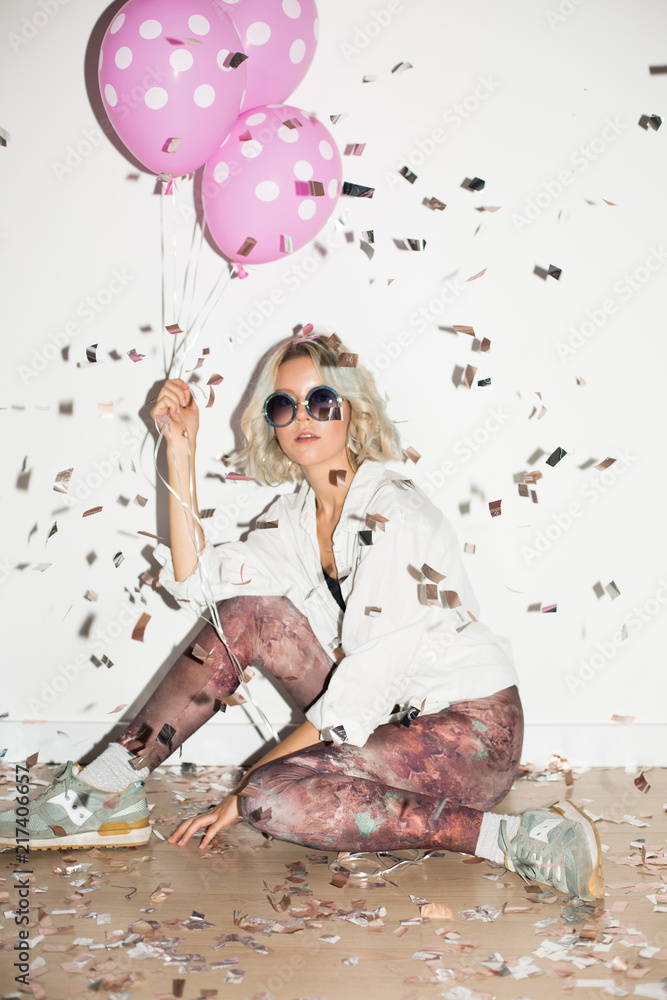 Pretty girl in sunglasses dreamily looking in camera with pink balloons in hand and confetti around over white background isolated