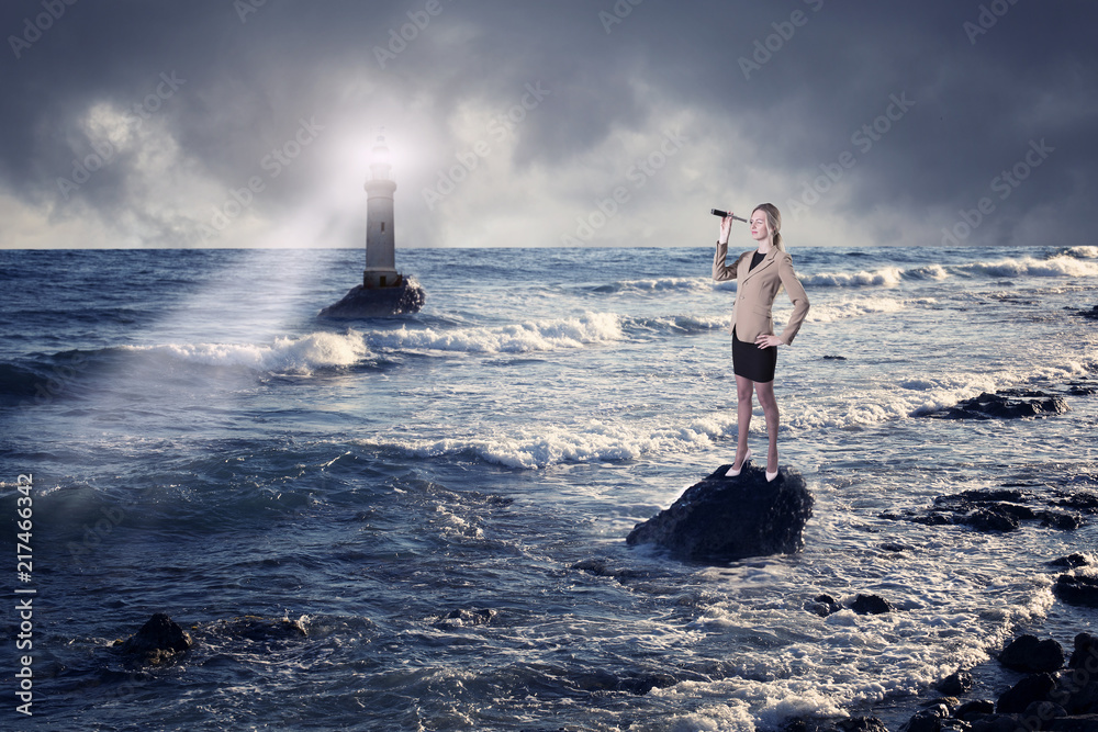 Businesswoman standing on a rock looking through a spyglass for business opportunity