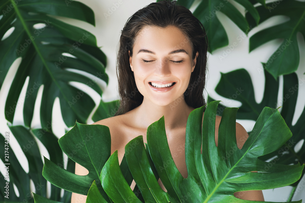 Portrait of young and beautiful woman with perfect smooth skin in tropical leaves