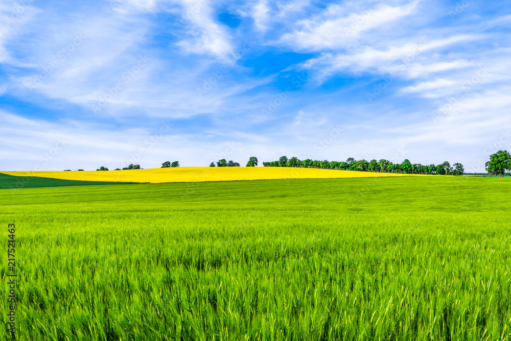 Spring field scenery and blue sky over fields, green farm, landscape