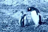 gentoo penguin parent with two hungry chics children in Antarctica, cute baby birds wildlife