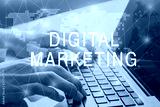 digital marketing concept, promotion of business on social networks, hands typing on computer on background