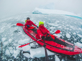 kayaking in Antarctica, couple of kayakers doing travel selfie with icebergs, extreme sport adventure honeymoon