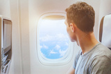 passenger of airplane looking at window, international travel, happy man tourist enjoy flight in comfortable air plane