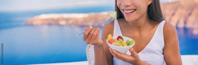 Healthy eating woman breakfast fruit bowl. Banner panorama of girl with fruits salad bowl on travel vacation.