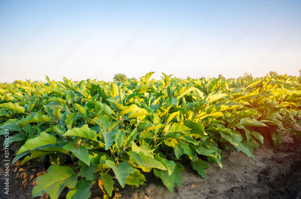 eggplant plantations grow in the field. vegetable rows. farming, agriculture. Landscape with agricultural land. crops